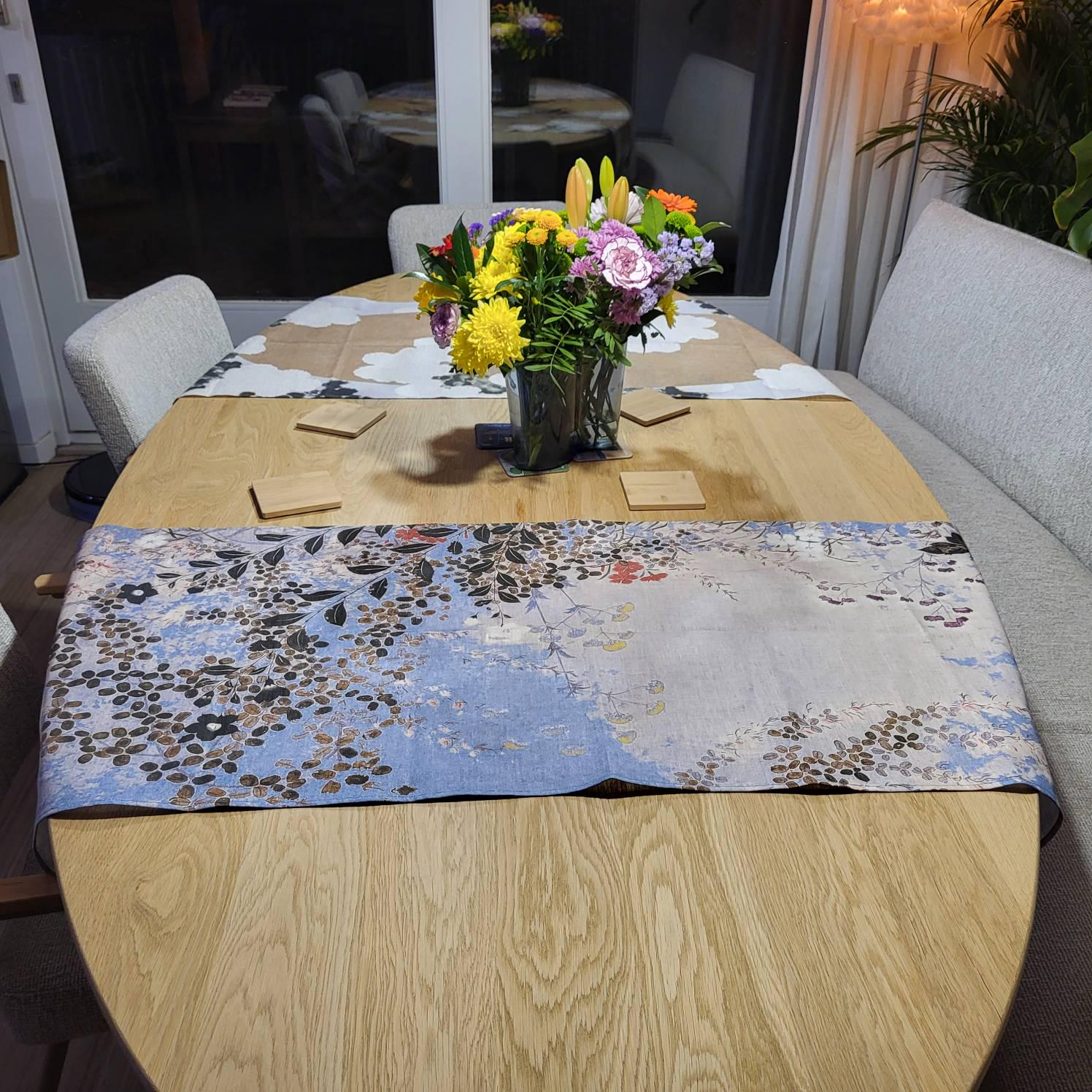 Linen table runner "Japanese autumn flowers" (19th century) vintage painting. Wabi Sabi collection.