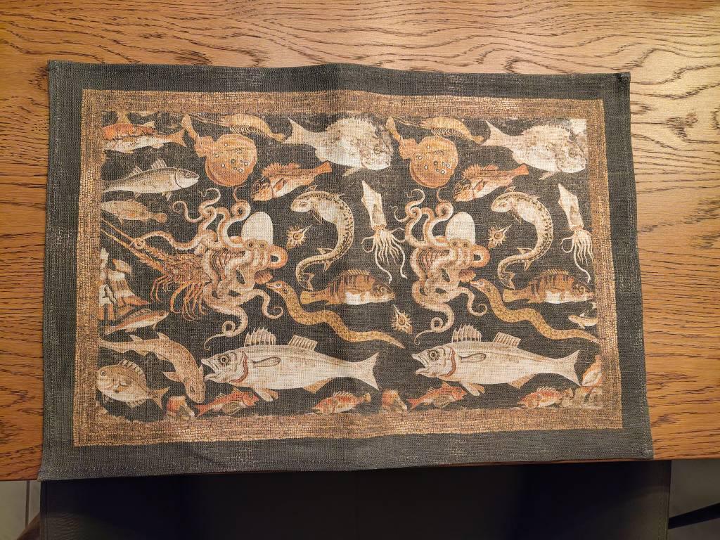 Placemats set with the famous fish mosaic from Pompeii "Octopus struggling with a crayfish, with a background of fishes and marine creatures".