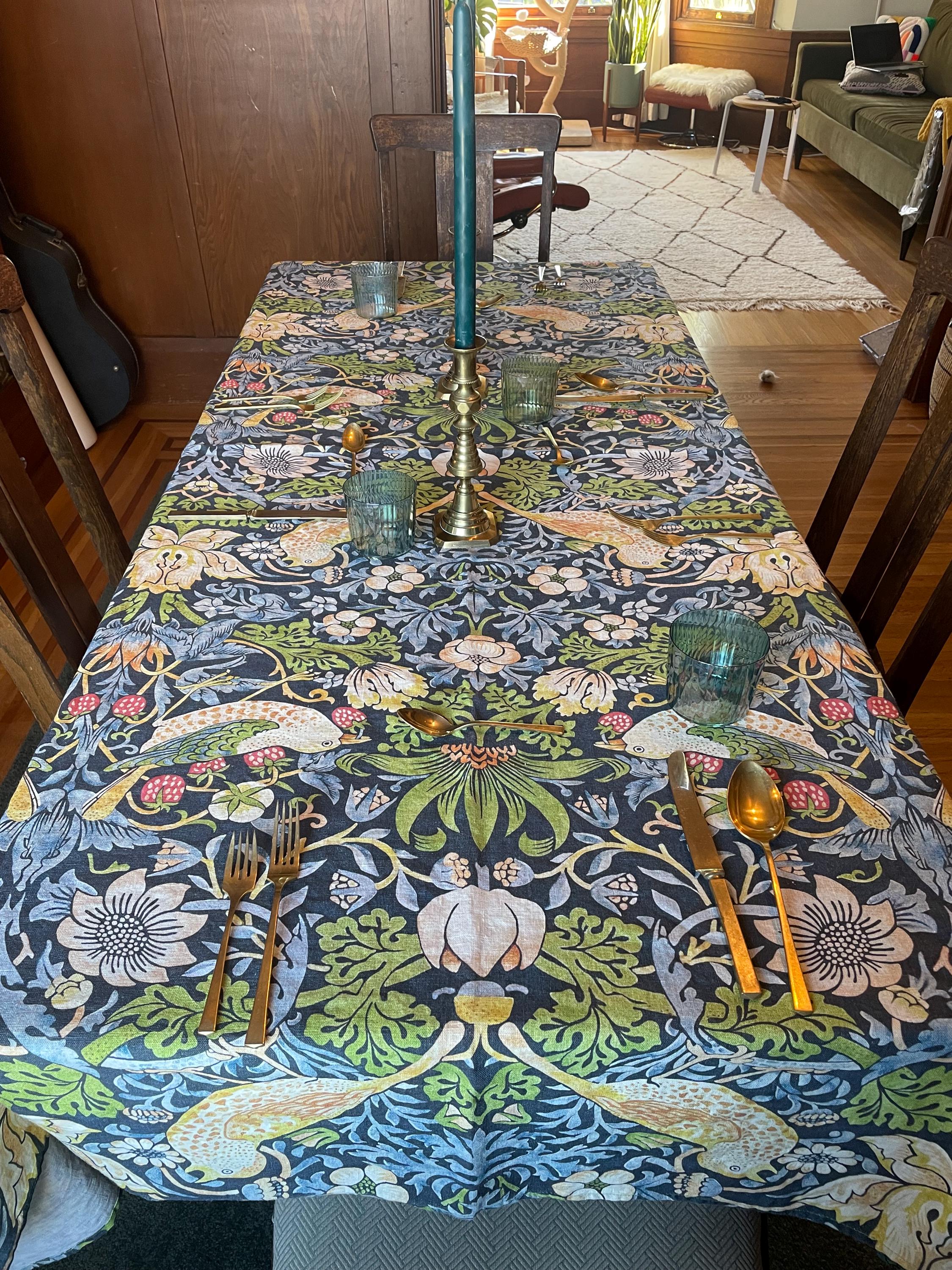 Rustic linen tablecloth William Morris "Strawberry Thief". This linen tablecloth is handmade from 100% natural linen – perfect for weddings, farmhouse dining, or everyday use. We have matching linen placemats, napkins and table runner.