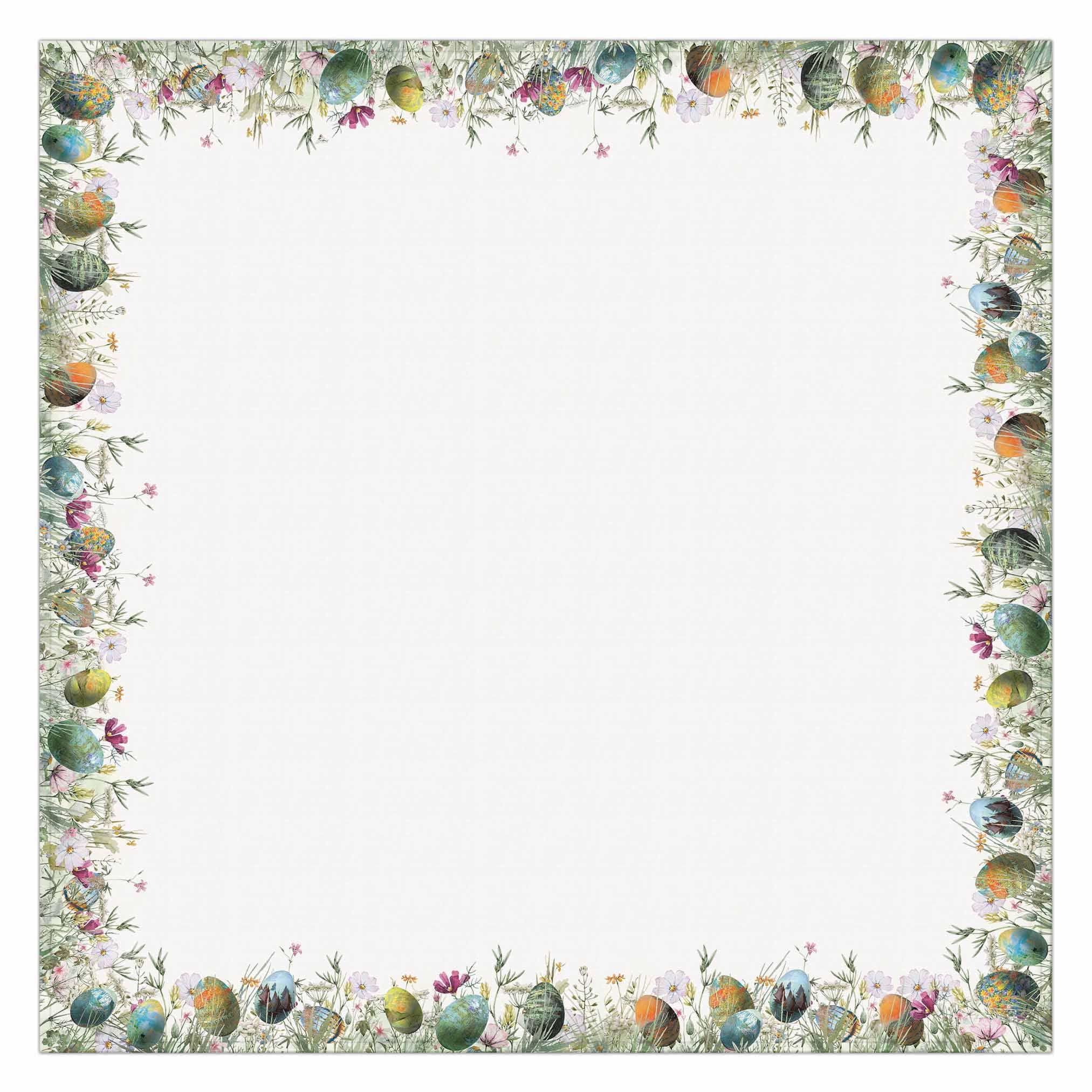 Easter tablecloth with different Claude Monet artworks on eggs.