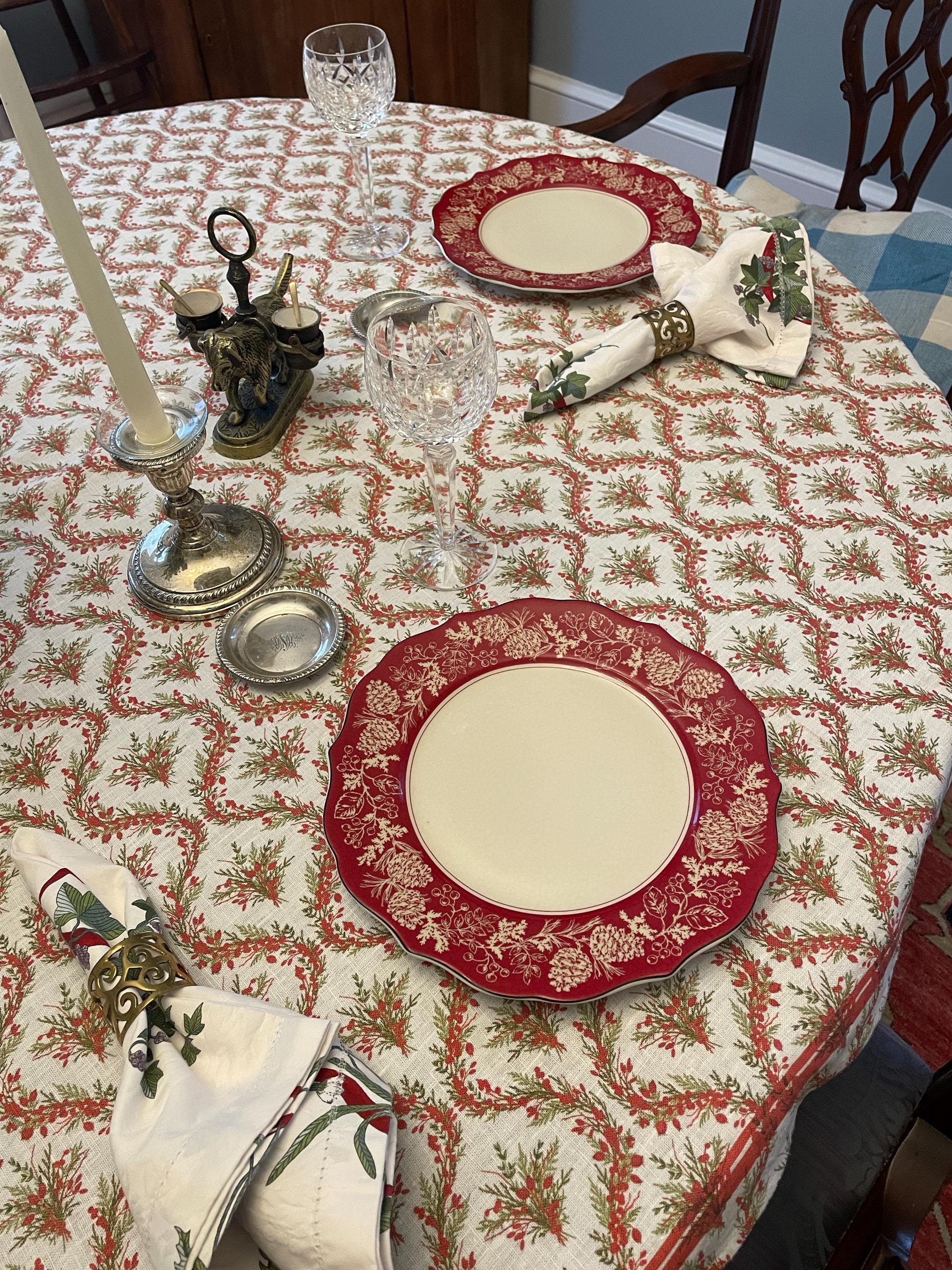 Tablecloth Winter Berry Garland. Holiday dining room table decor. We have matching linen placemats, napkins or table runners.