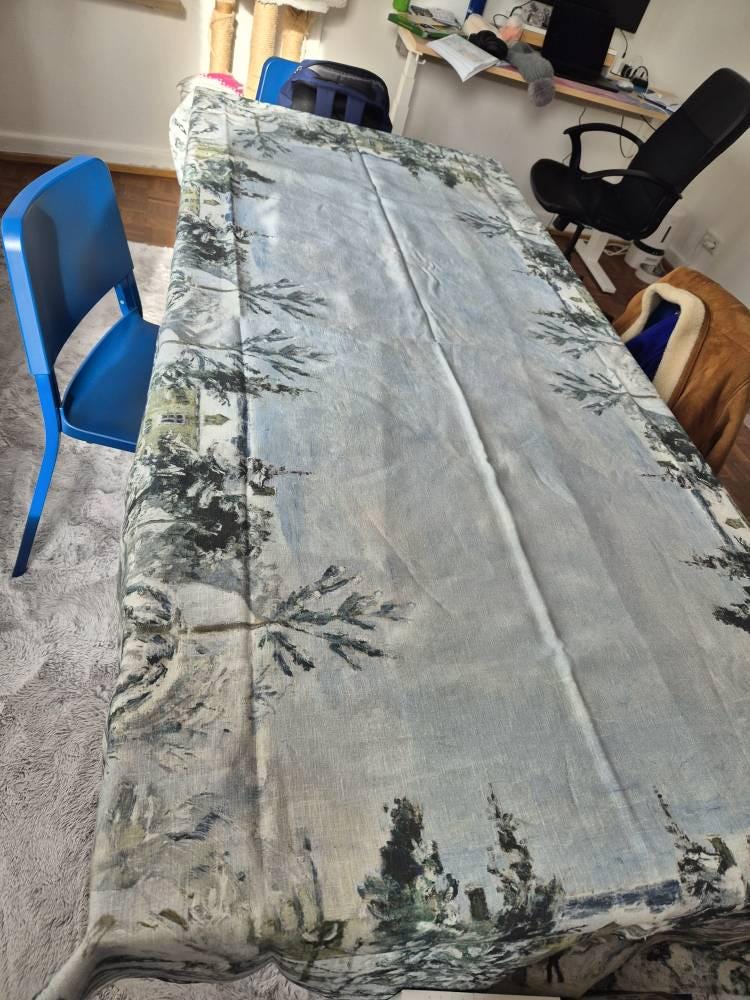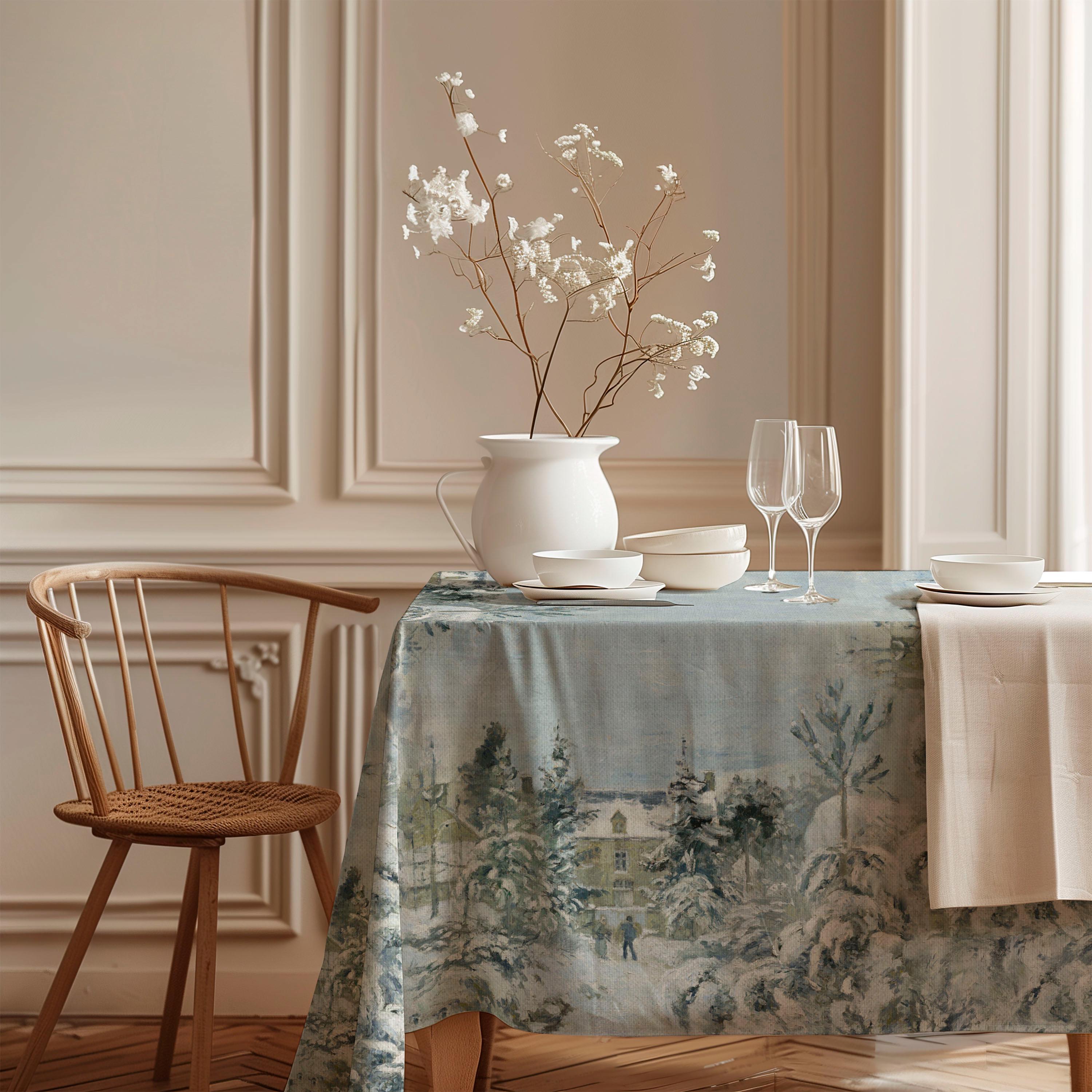 Holiday tablecloth Piette's House at Montfoucault by Camille Pissarro. This linen tablecloth is handmade from 100% natural linen – perfect for weddings, farmhouse dining, or everyday use. We have matching linen placemats, napkins and table runner.