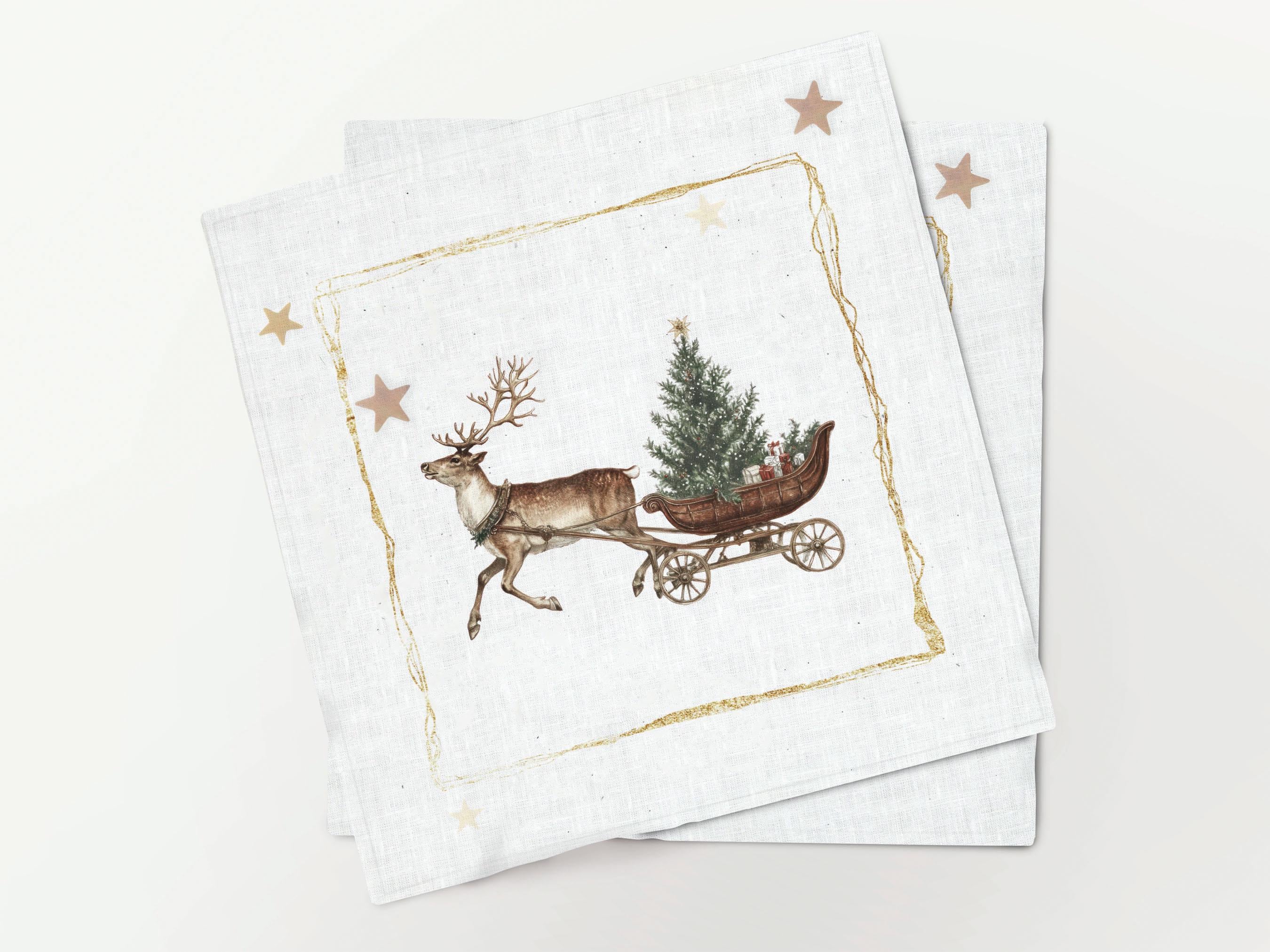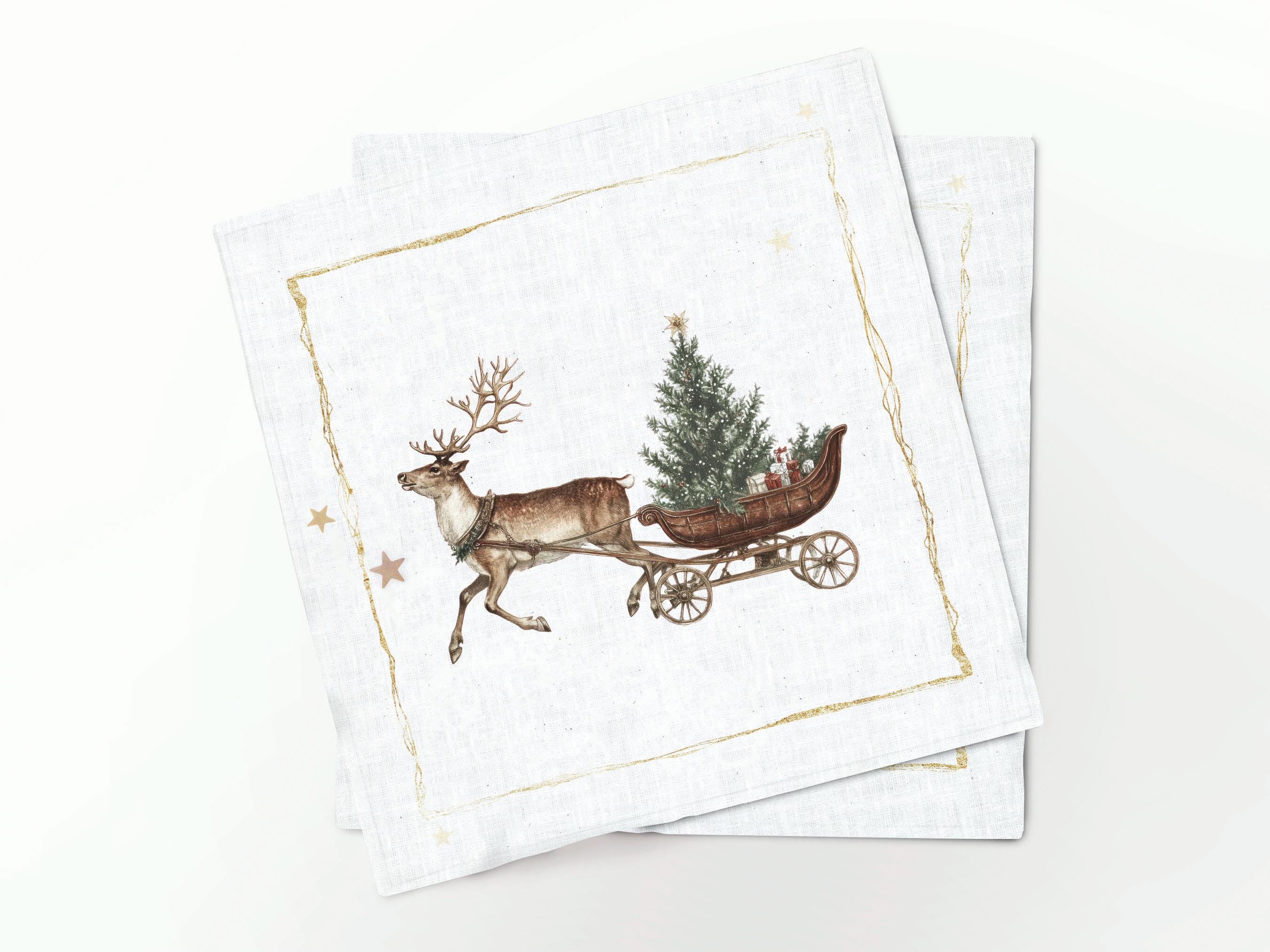 Each piece features a beautifully detailed illustration of a reindeer pulling a wooden sleigh filled with a Christmas tree and gifts — a timeless symbol of warmth, generosity, and winter charm.