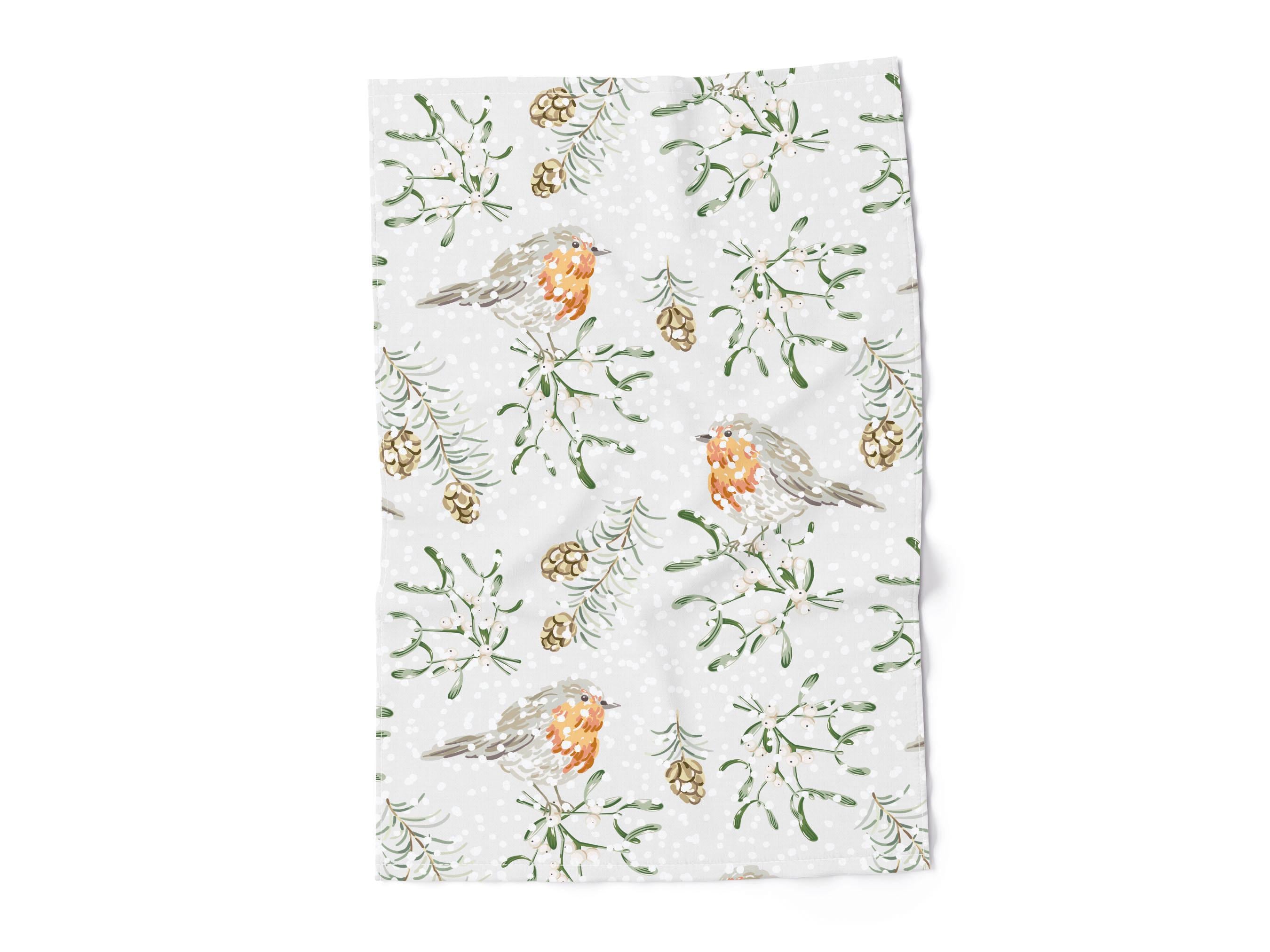 Kitchen towel "Winter Robins". Linen towel with hook.