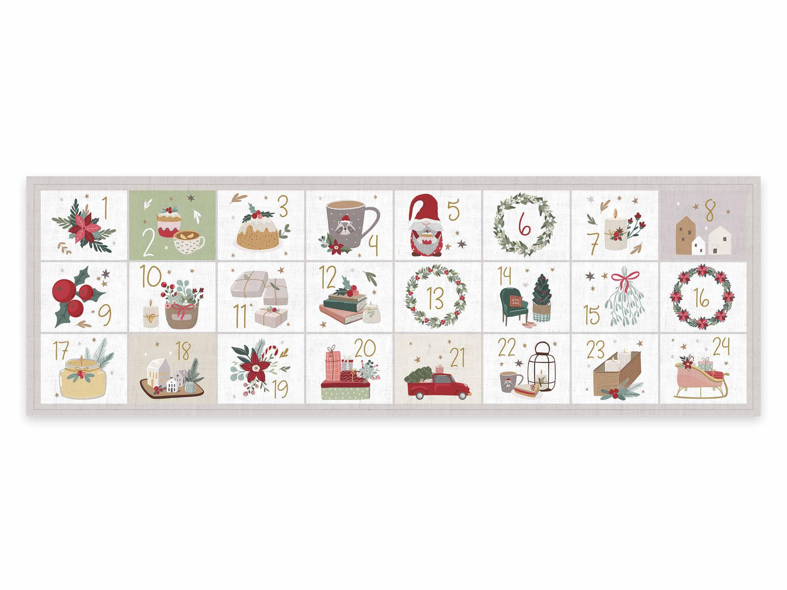 Each of the 24 illustrated squares features a different festive motif: candles, wreaths, gifts, cookies, and winter greenery — all beautifully printed on natural linen fabric.