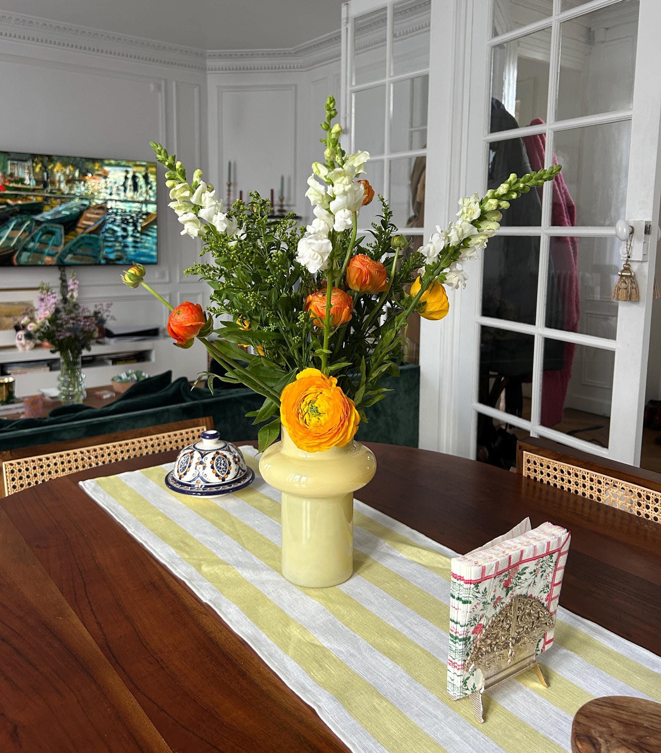 Decorate your table with sunny yellow striped table runner, inspired by Scandinavian simplicity and relaxed coastal living. Perfect for summer gatherings, Easter, weddings, and everyday dining, it brings a fresh, cheerful touch to any occasion. Design that feels light, natural, and effortlessly elegant.