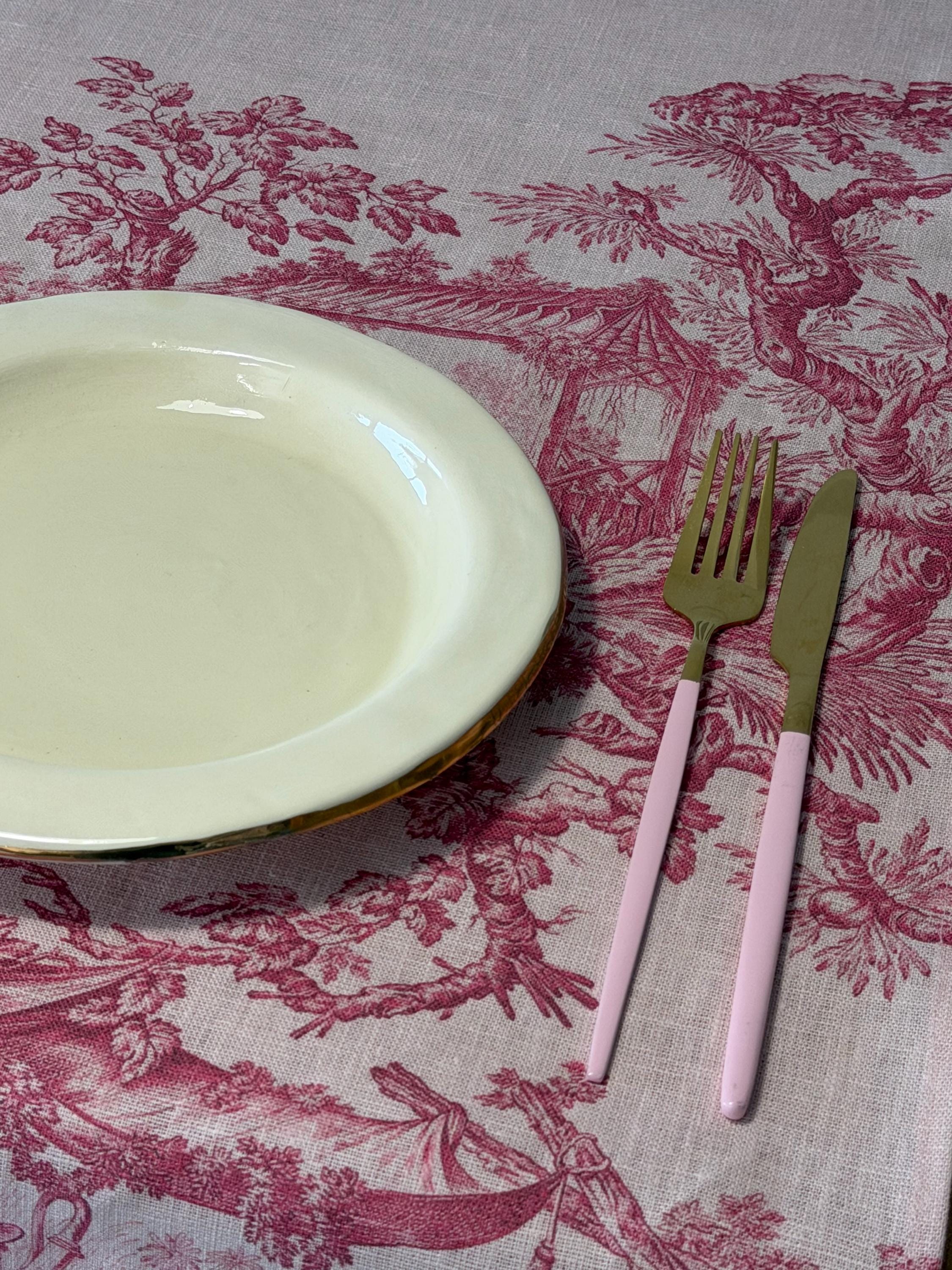 A Toile de Jouy tablecloth with a soft, romantic pink palette and an elegant vintage scene, bringing French charm to your table. Perfect for Valentine’s Day, it is also ideal for weddings, anniversaries, dinners, and special celebrations year-round. A truly classic, refined, and effortlessly sophisticated table essential.