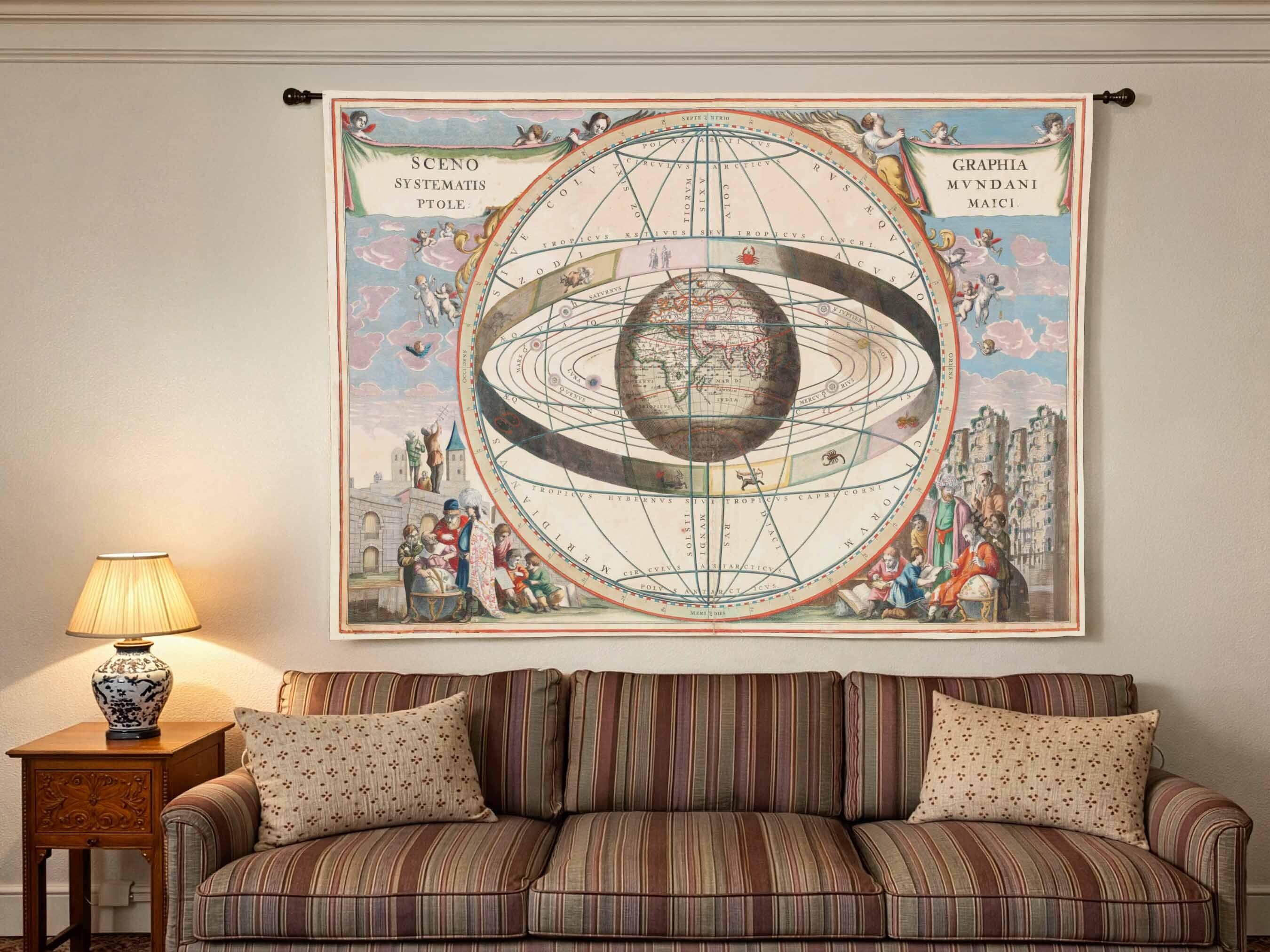 Harmonia Macrocosmica, 1660/61, Linen Wall Tapestry, 100% linen. From Andreas Cellarius Harmonia Macrocosmica, 1660/61. Chart showing signs of the zodiac and the solar system with the world at the centre.