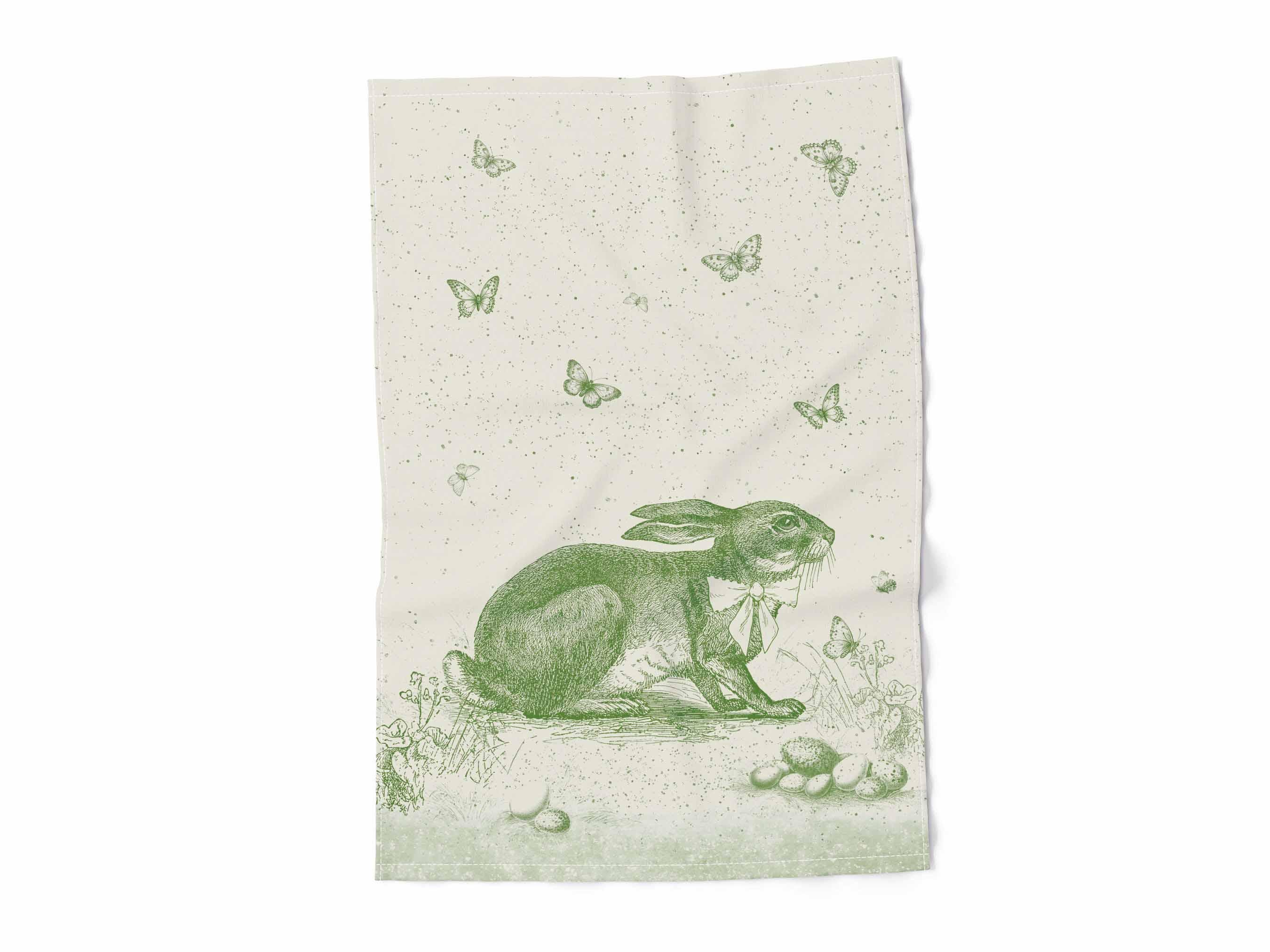 Easter towel "Toile de Joy Rabbit", green. Linen kitchen towel with hook. Hand made in Lithuania. Unique kitchen decor, housewarming gift, farmhouse decor.