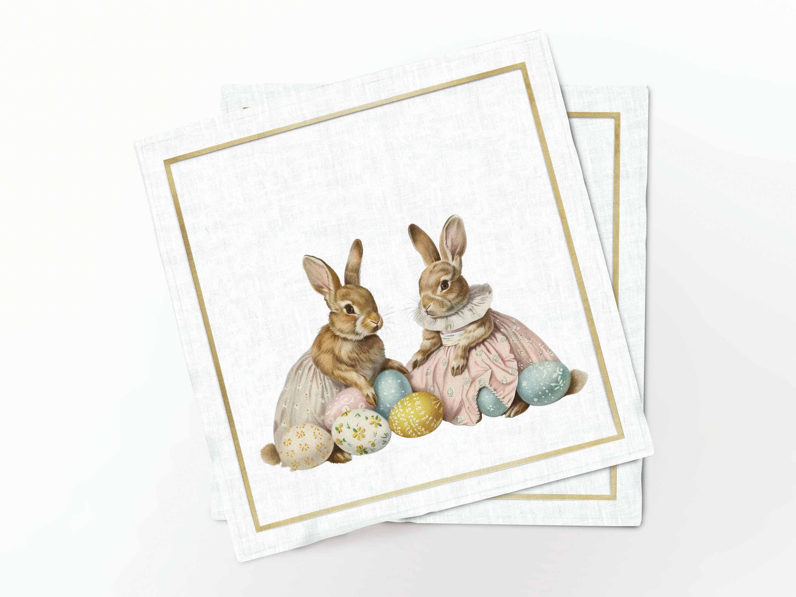 Linen napkins set Two Bunnies with Easter Eggs. We have matching linen placemats, table runner and dish towel.