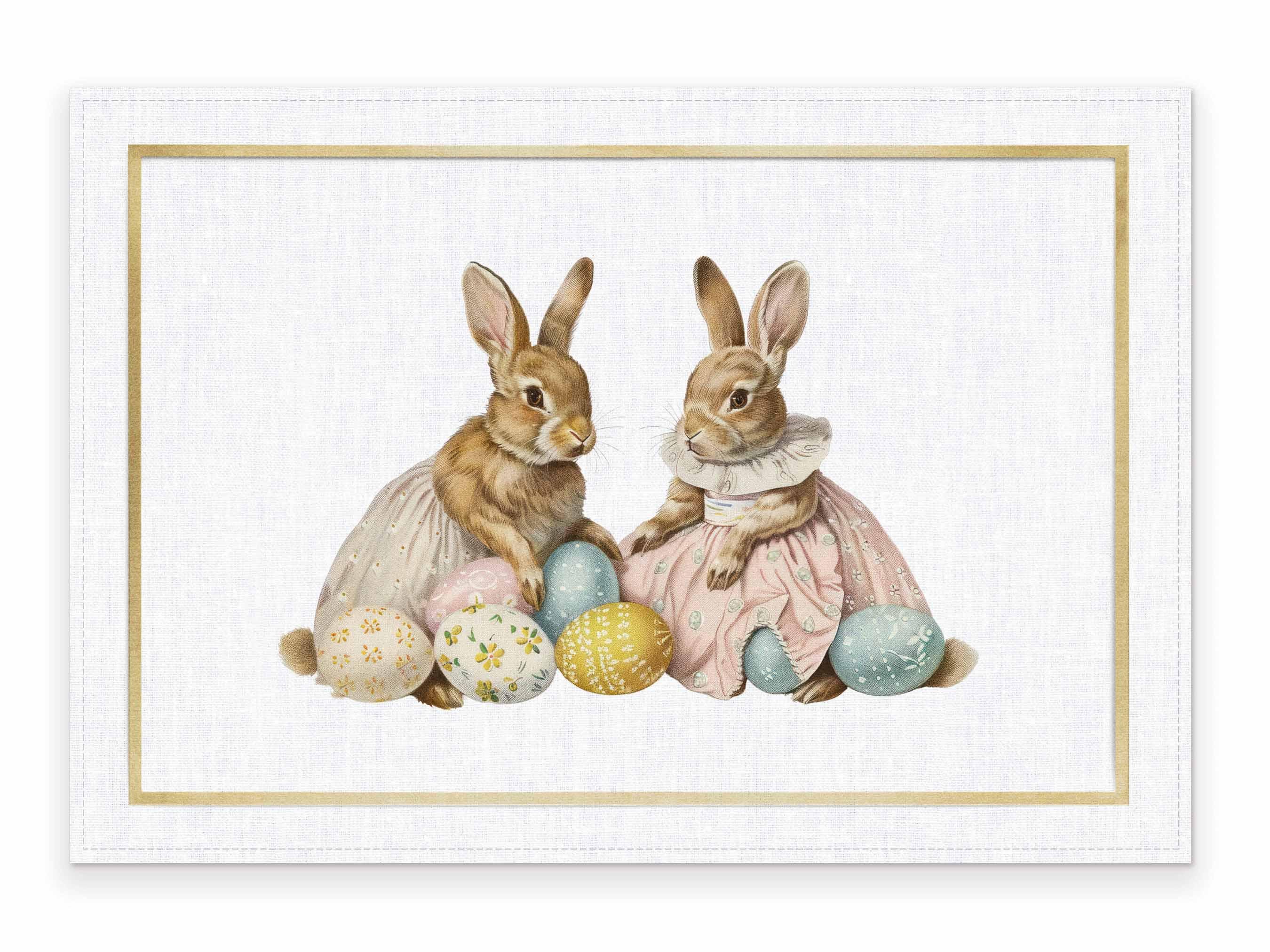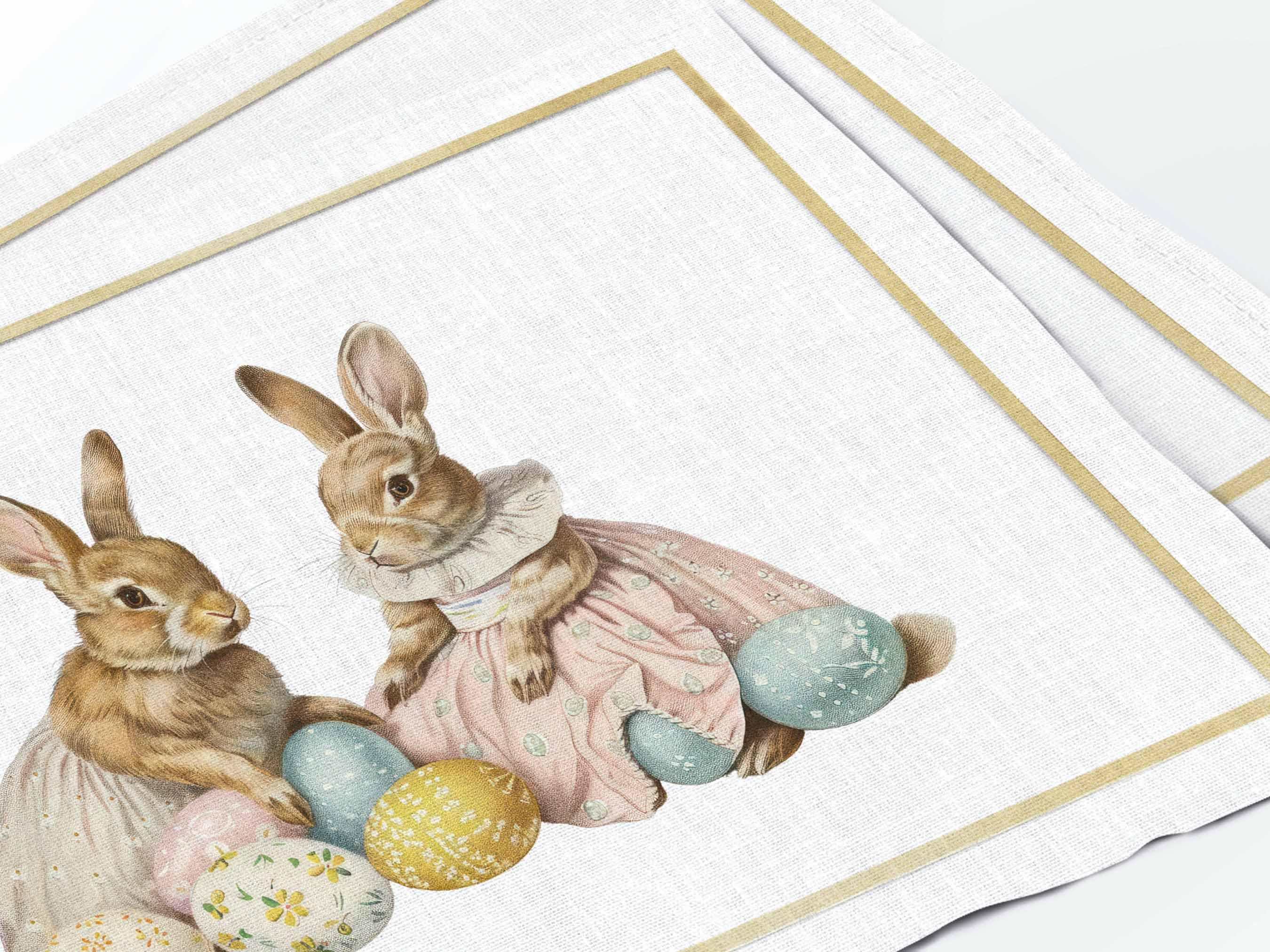 Placemats set Two Bunnies with Easter Eggs. Watercolor easter rabbit. We have matching linen napkins, table runner and dish towel.