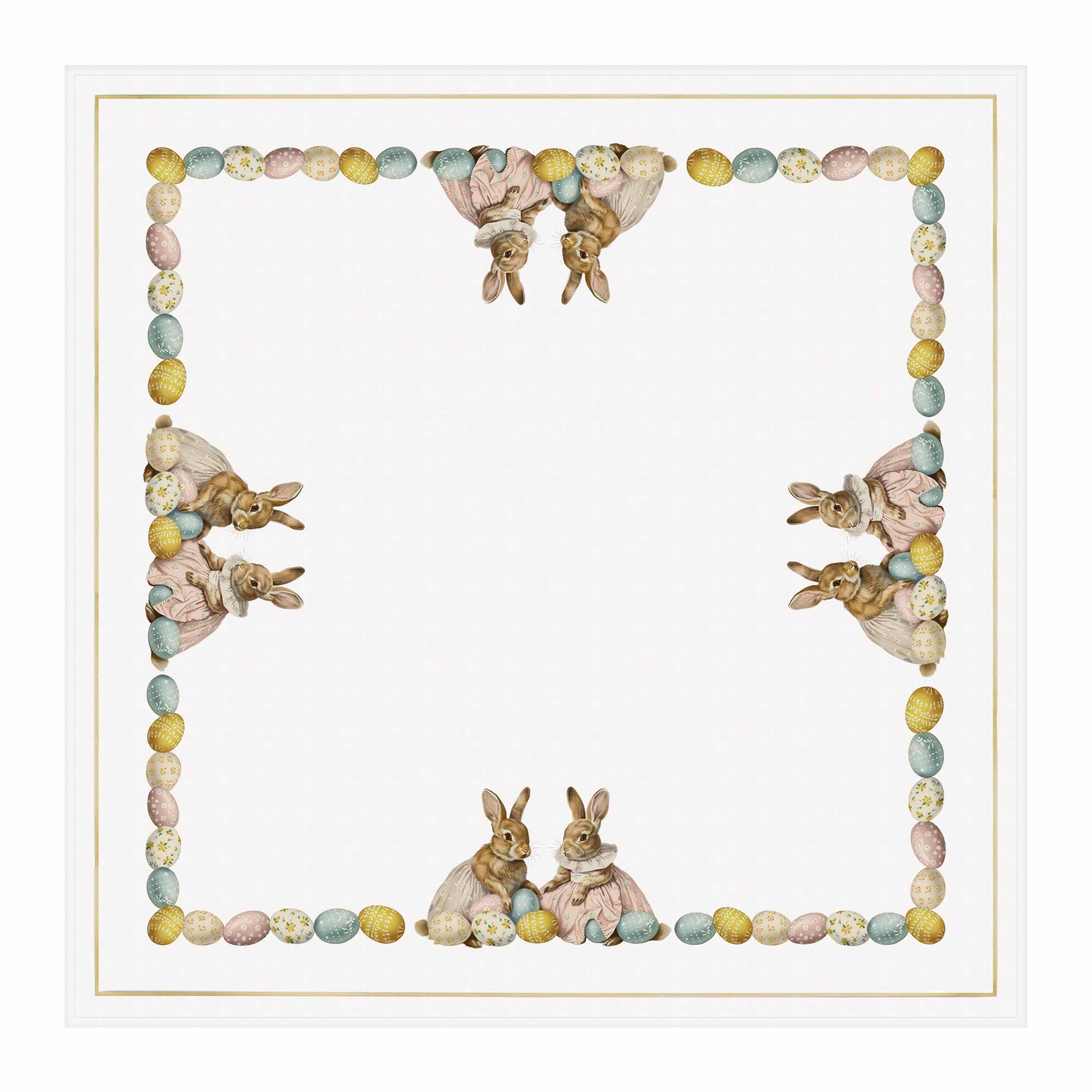 Wide Linen Tablecloth, Two Bunnies with Easter Eggs, 100% linen