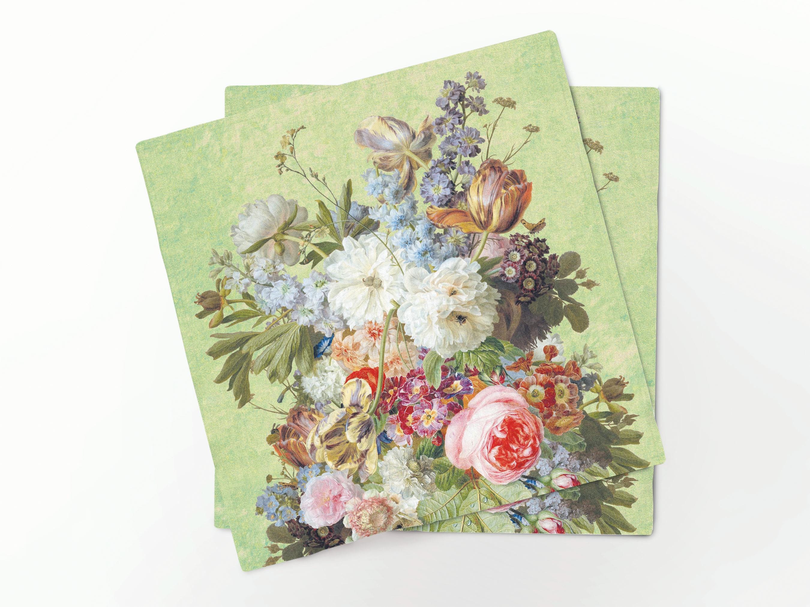 Linen napkins set Gerard van Spaendonck, Still Life. Green background. We have matching linen placemats, table runner and dish towel.