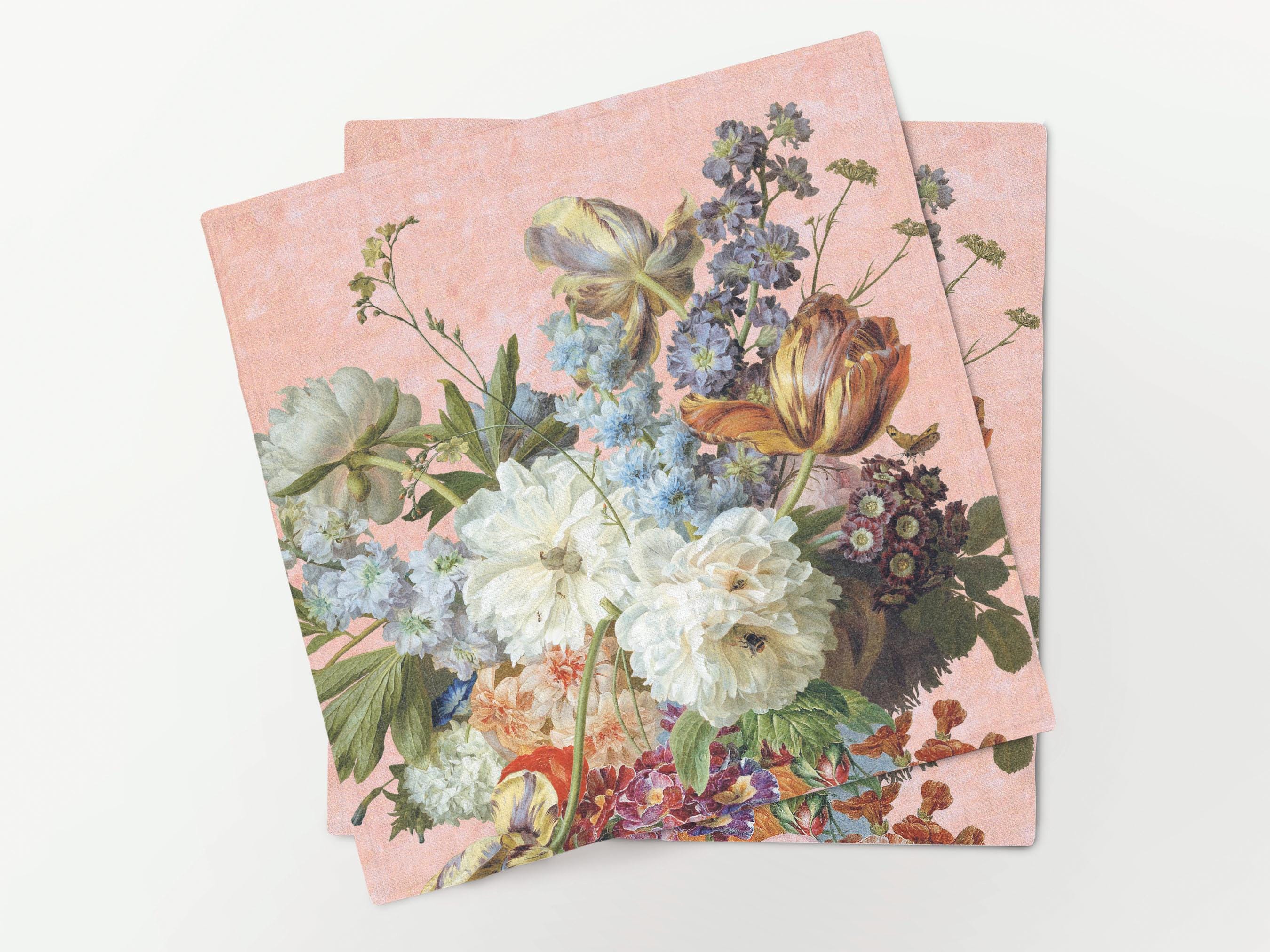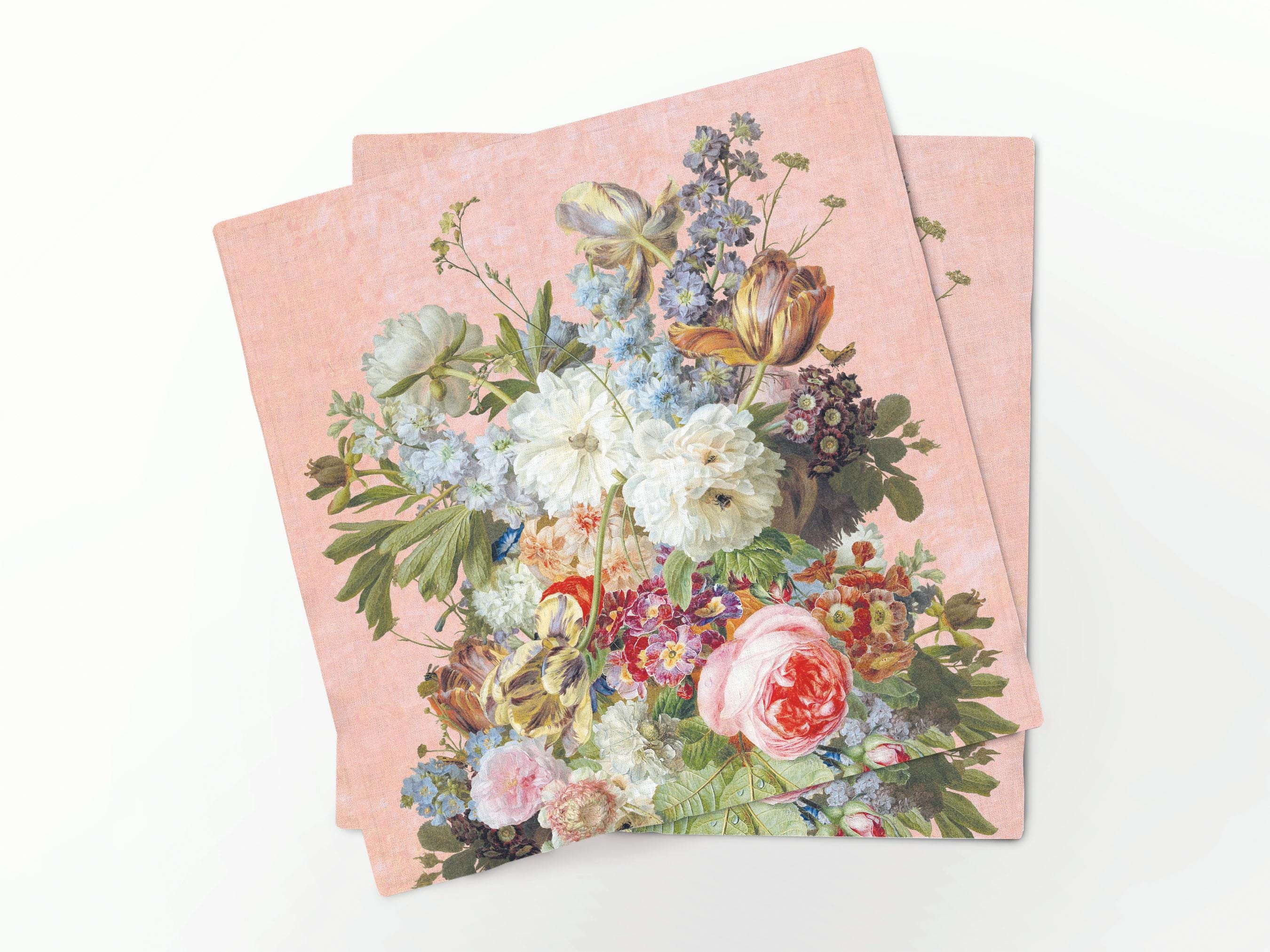 Linen napkins set Gerard van Spaendonck, Still Life. Pink background. We have matching linen placemats, table runner and dish towel.