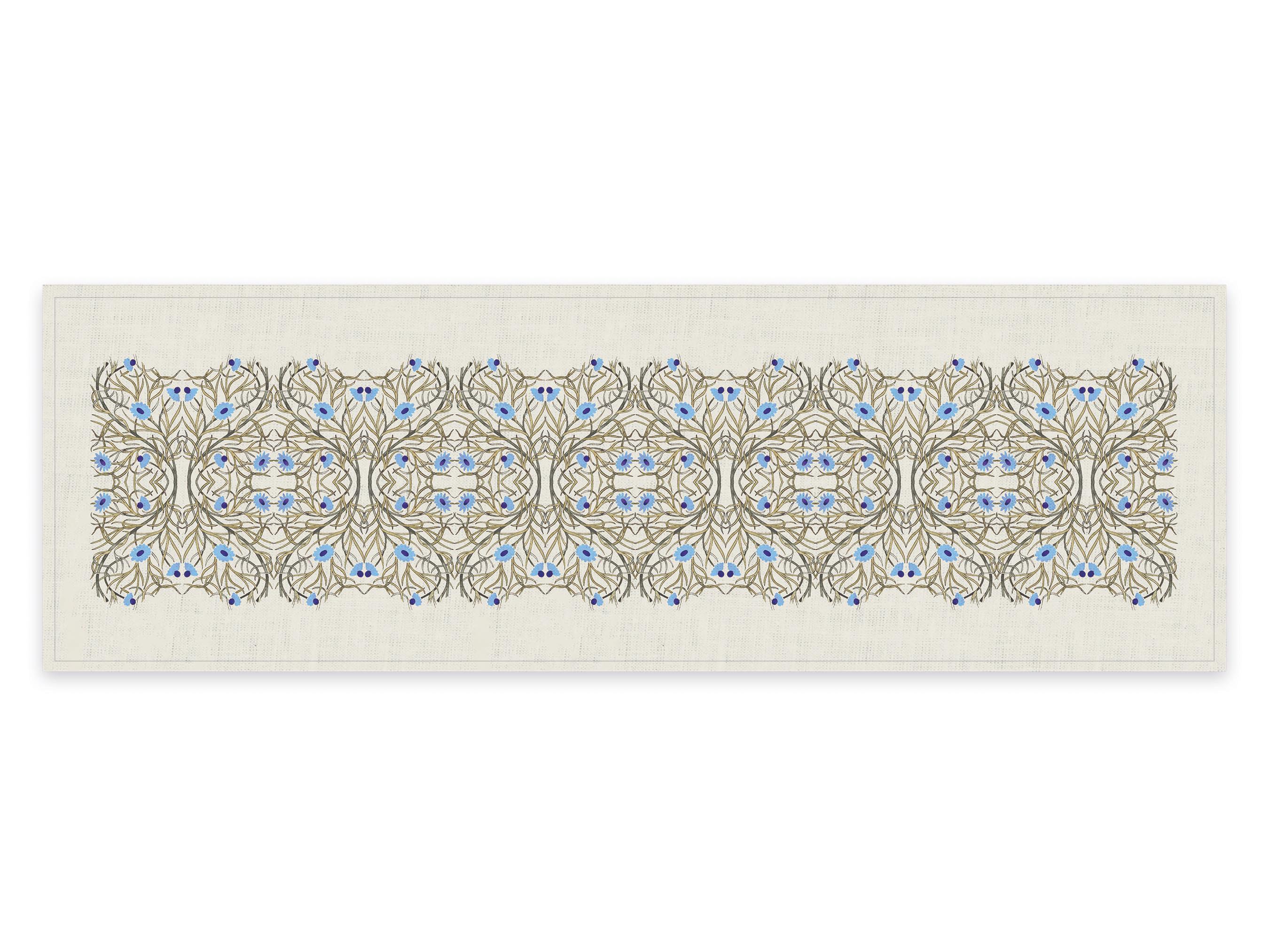 Linen table runner by William De Morgan design, blue edition. We have matching linen placemats, napkins and dish towel.