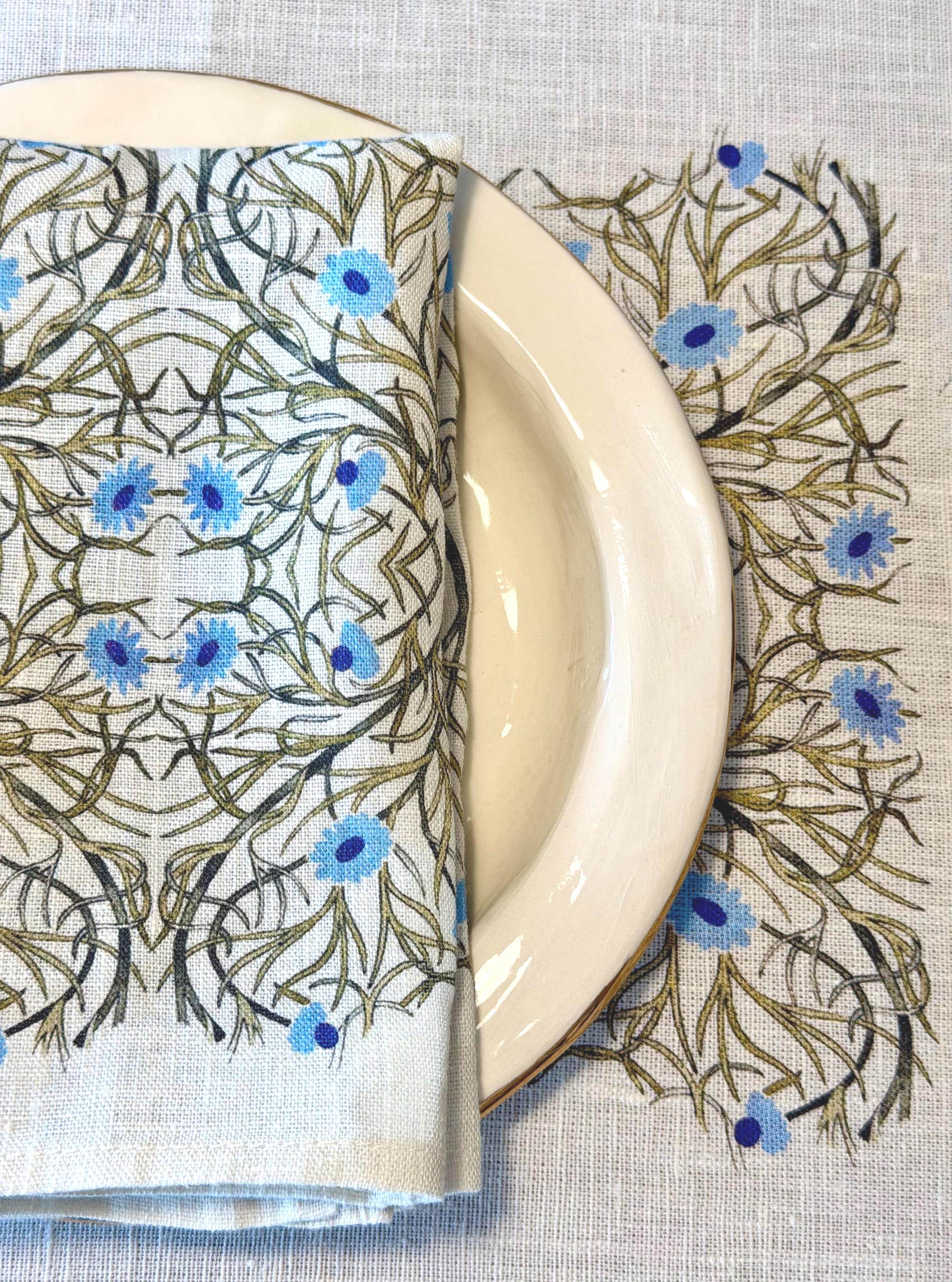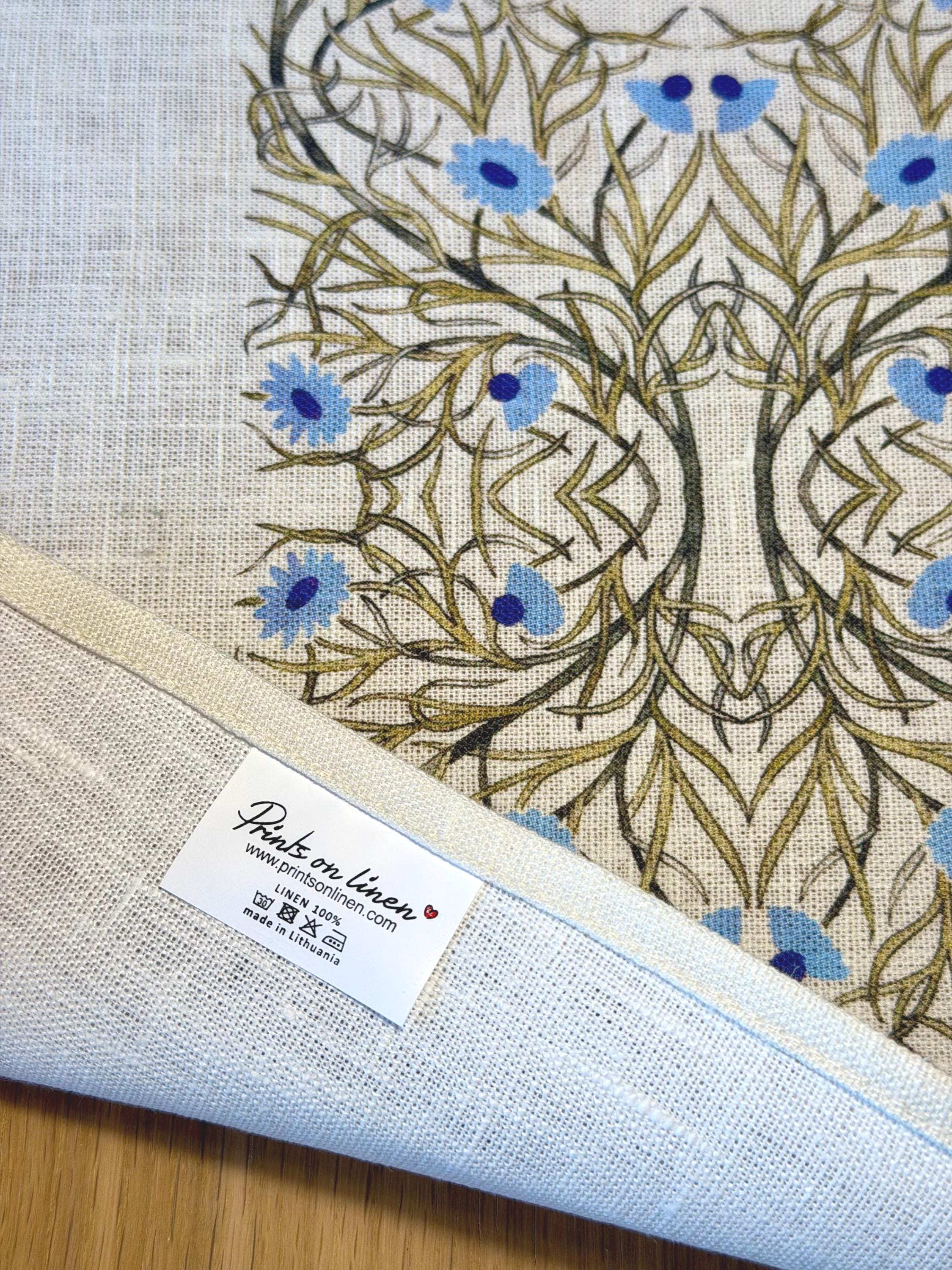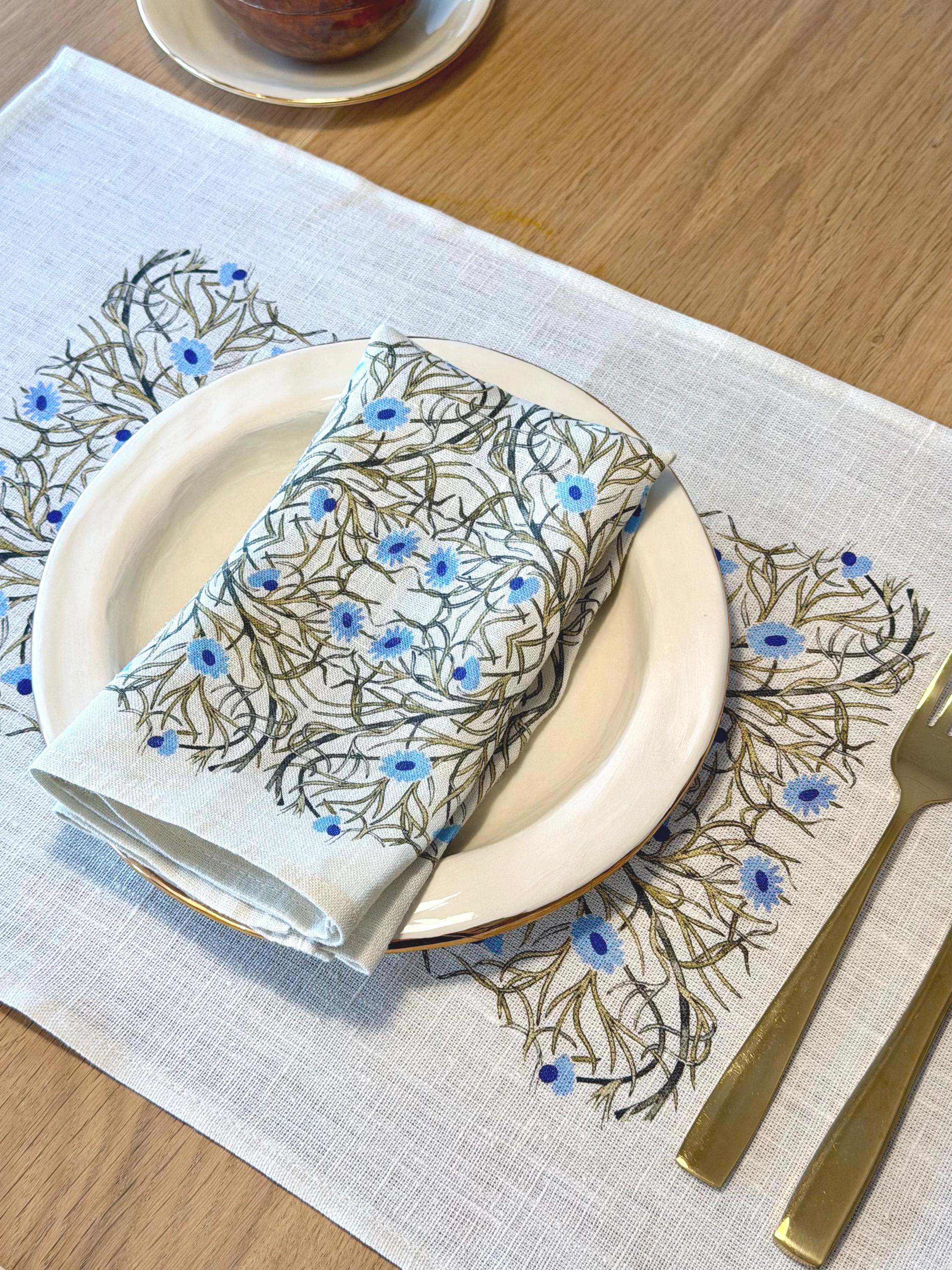 Napkins set William De Morgan design, Blue Edition. We have matching linen placemats, a table runner and dish towel.