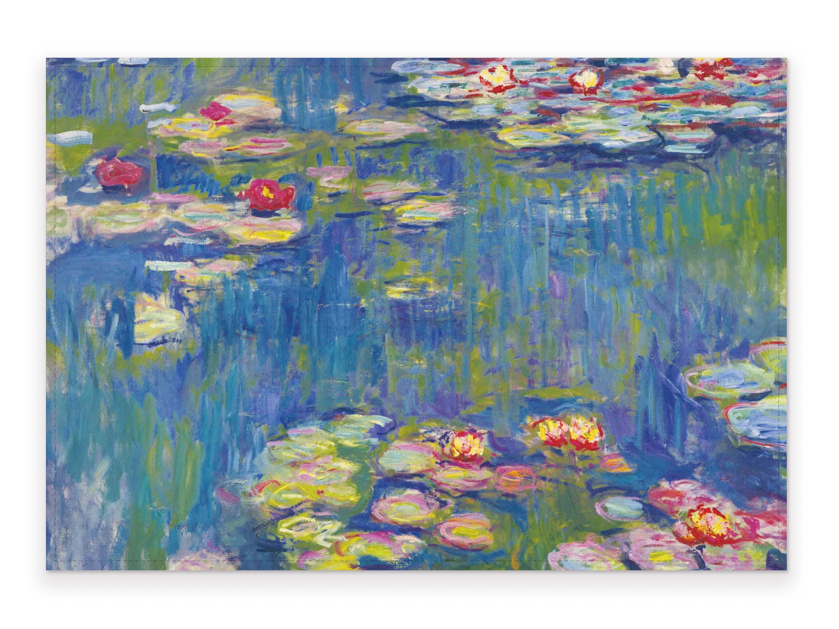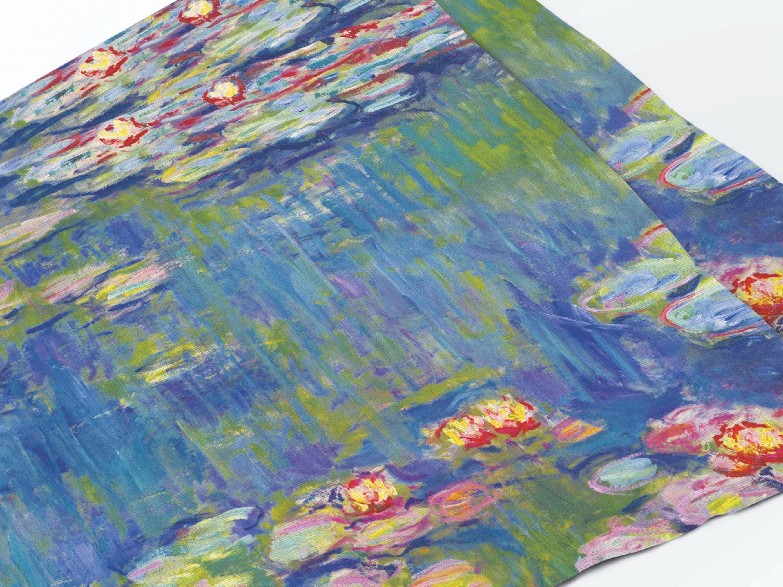 Placemats set Claude Monet "Water Lilies". Water Lilies is a series of approximately 250 oil paintings by French Impressionist Claude Monet. The paintings depict his flower garden at his home in Giverny, and were the main focus of his artistic production during the last thirty years of his life. We have matching linen napkins, table runner and dish towel.