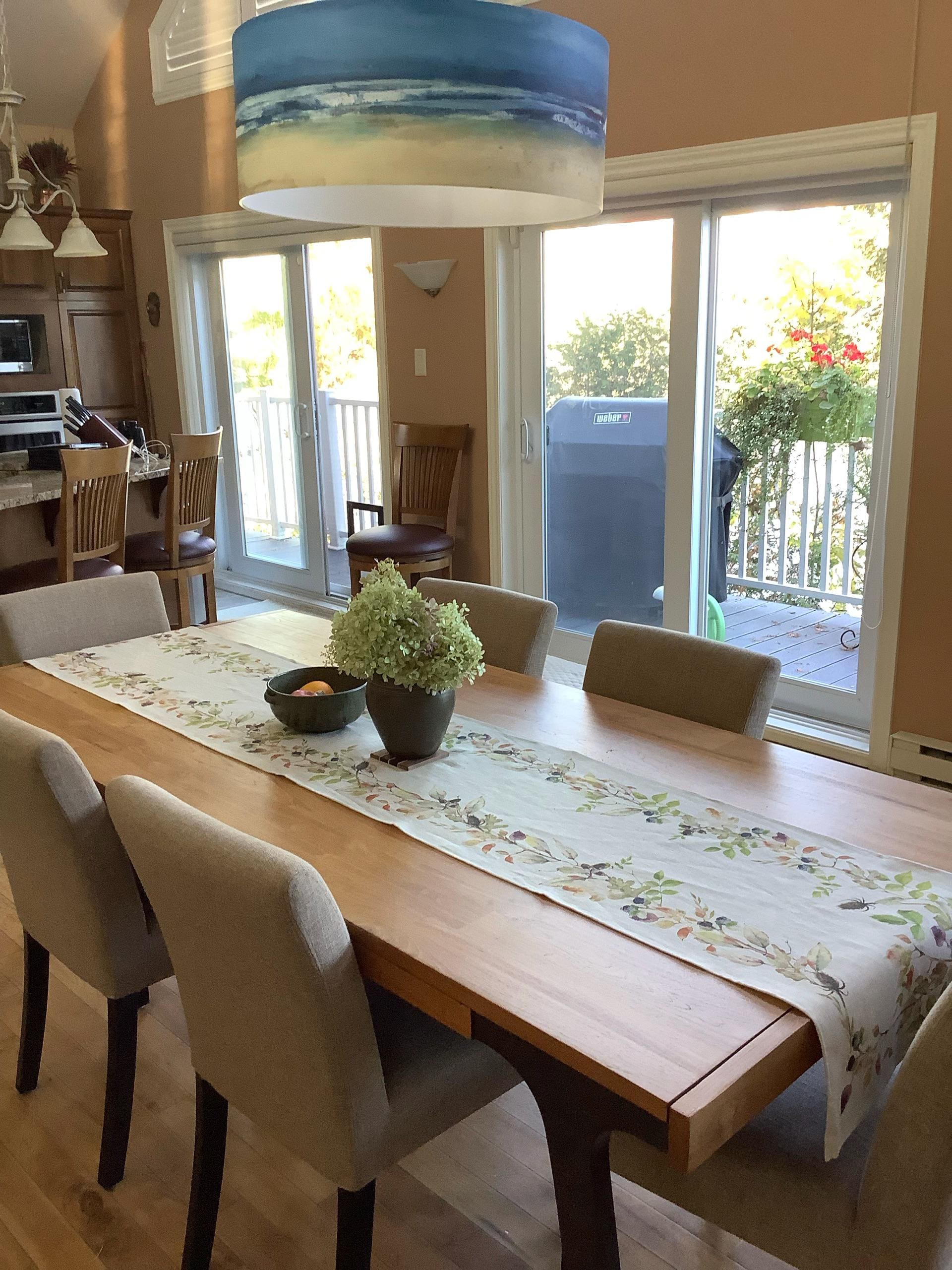 Thanksgiving table runner with leaves and berries art. Idea for reception decor, table decor, housewarming gift. We have matching linen placemats, napkins and tablecloth.